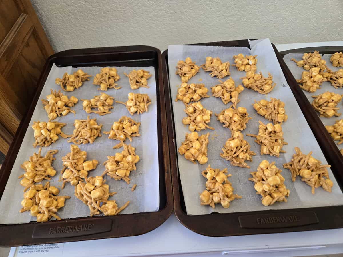 - Set Up Your Cooling Area: To make the haystacks, you’ll need to set up some cookie sheets lined with wax paper, or parchment paper. You can also simply line your clean workspace or countertop and drop the cookies on that.